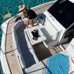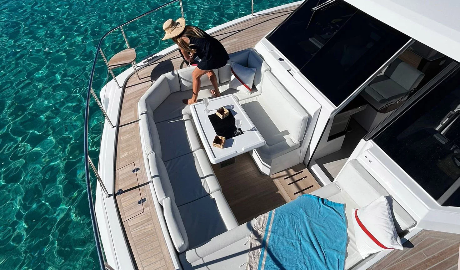 À l’arrière, une spacieuse plateforme immergée, un généreux salon extérieur accueillant jusqu’à 8 personnes, et des côtés rabattables en option.