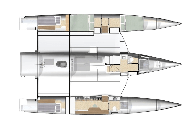 Les cabines, situées sur le pont principal et dans les flotteurs, proposent un espace de vie ouvert. Contrairement au NEEL 47, les flotteurs sont accessibles directement via le salon sécurisé. La suite propriétaire bénéficie d’un accès privé à la mer, offrant une expérience de luxe incomparable.