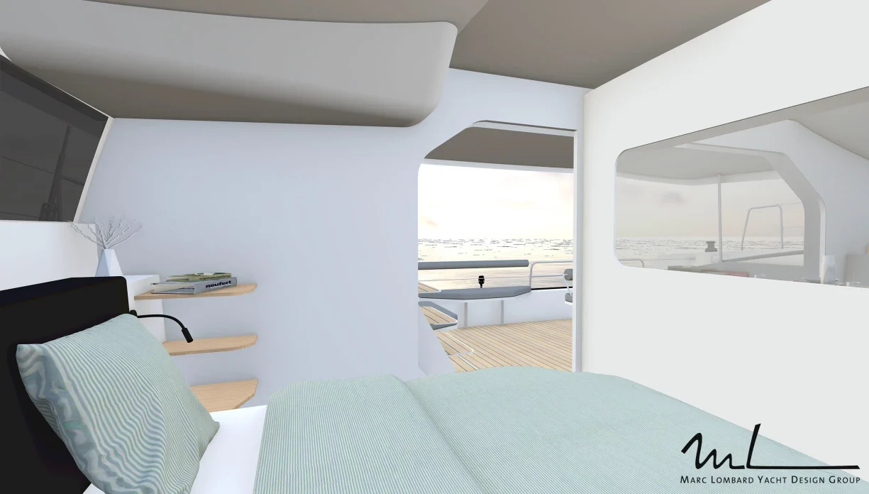 Les cabines, situées sur le pont principal et dans les flotteurs, proposent un espace de vie ouvert. Contrairement au NEEL 47, les flotteurs sont accessibles directement via le salon sécurisé. La suite propriétaire bénéficie d’un accès privé à la mer, offrant une expérience de luxe incomparable.